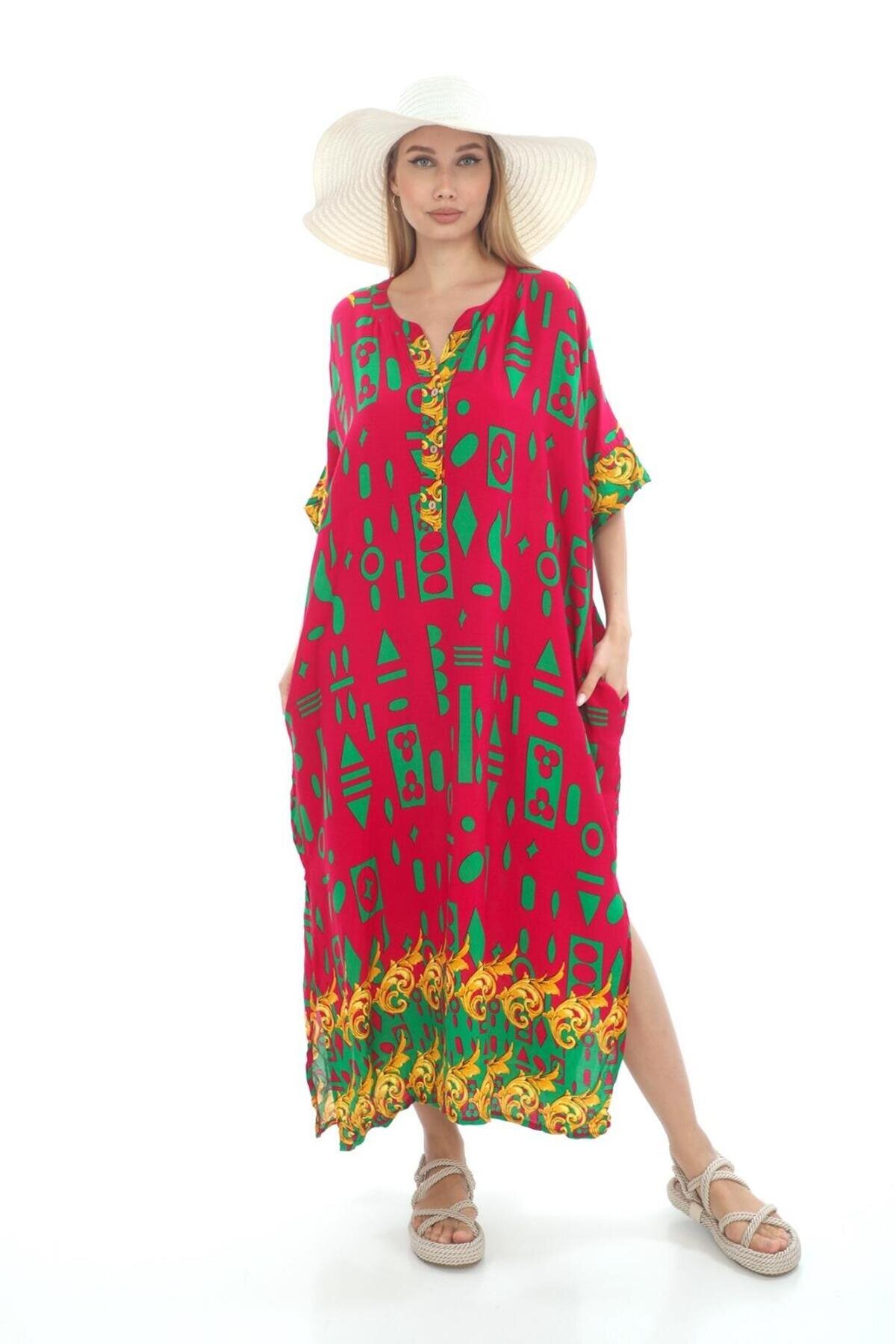 Bohem StilKırmızı Uzun Yırtmaç Detaylı Zarin Düğmeli Elbise
