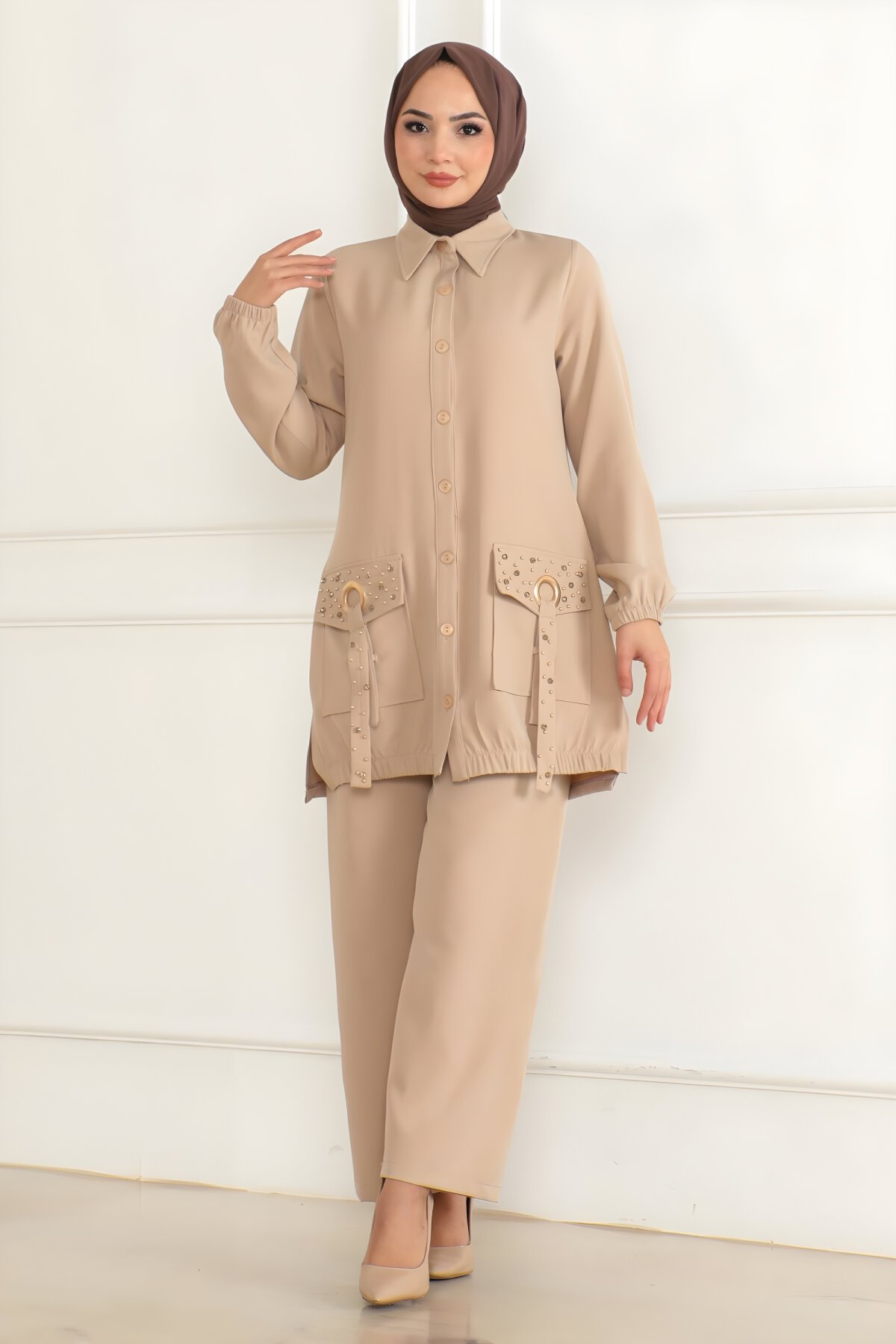 ModamihramCep Detaylı Bej İkili Tesettür Takım