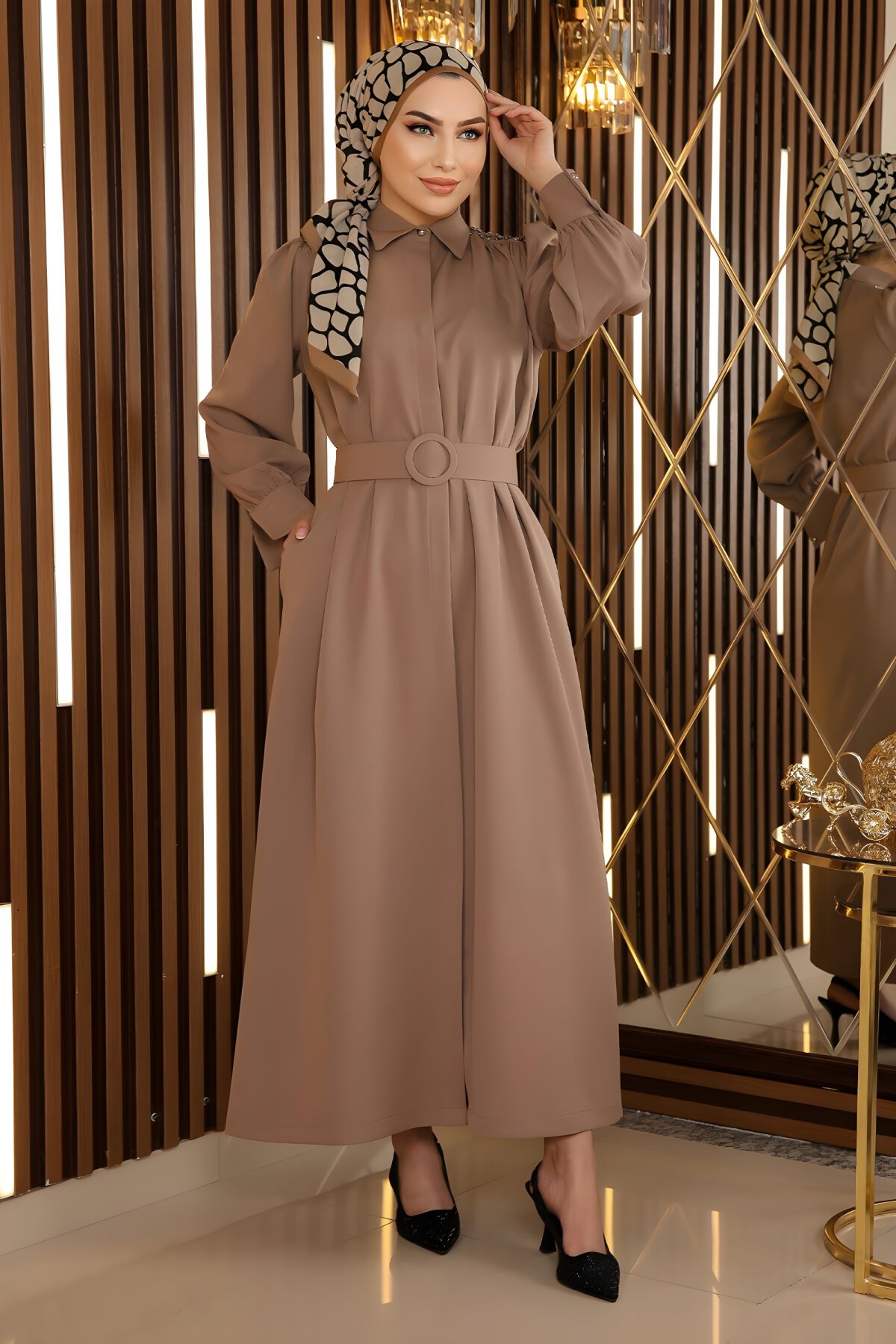 ModamihramTaş Detaylı Kemerli Vizon Tesettür Elbise