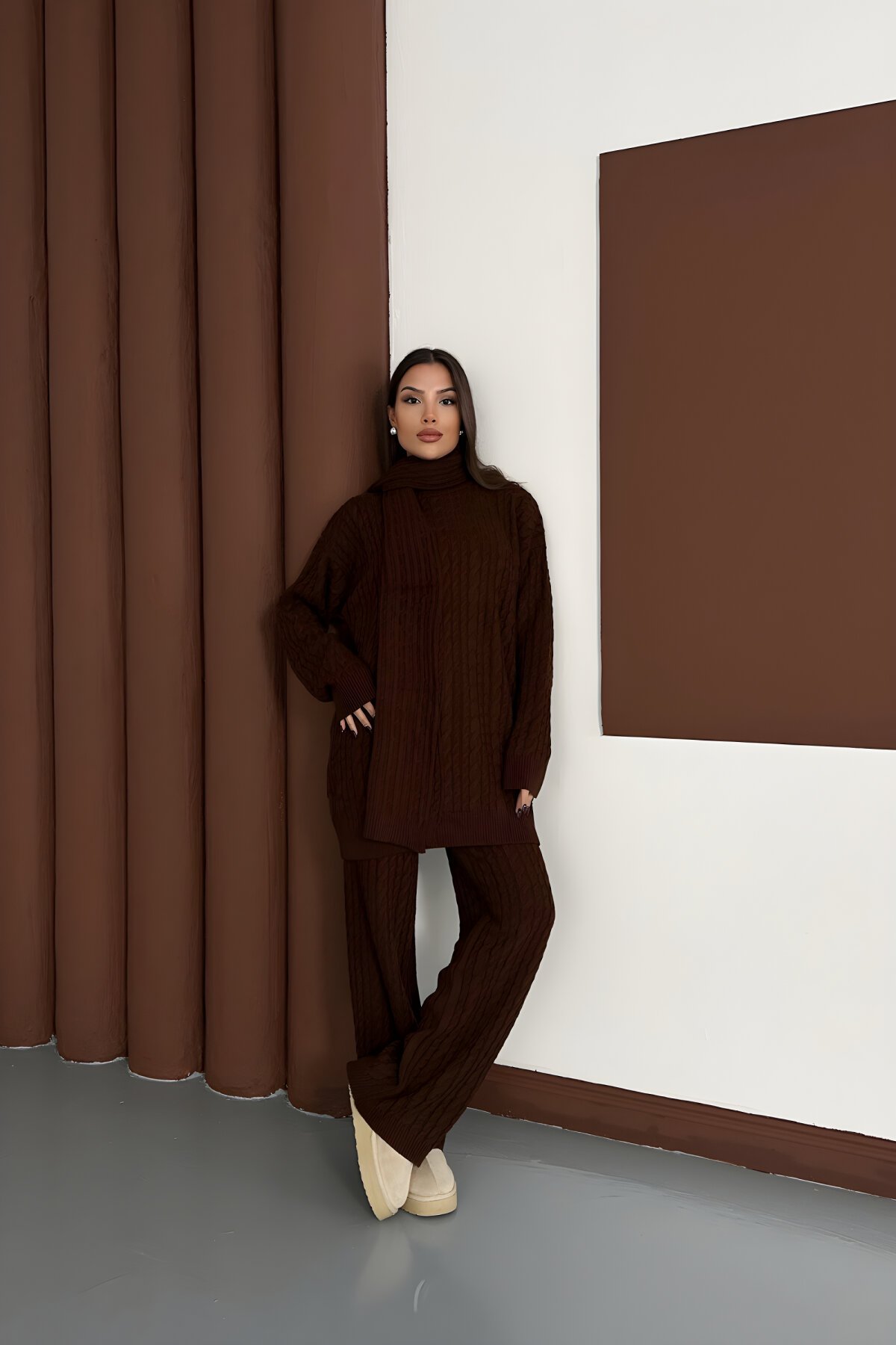 MegaButik’in şık koleksiyonunda yer alan Mozena marka kahverengi fularlı örgü detaylı triko kazak ve pantolon ikili takım, soğuk günlerde hem konforu hem de zarafeti bir arada sunuyor. Yumuşak dokusu ve modern tasarımıyla günlük stilinizi tamamlayacak bu takımı şimdi keşfedin ve gardırobunuza şık bir dokunuş katın.