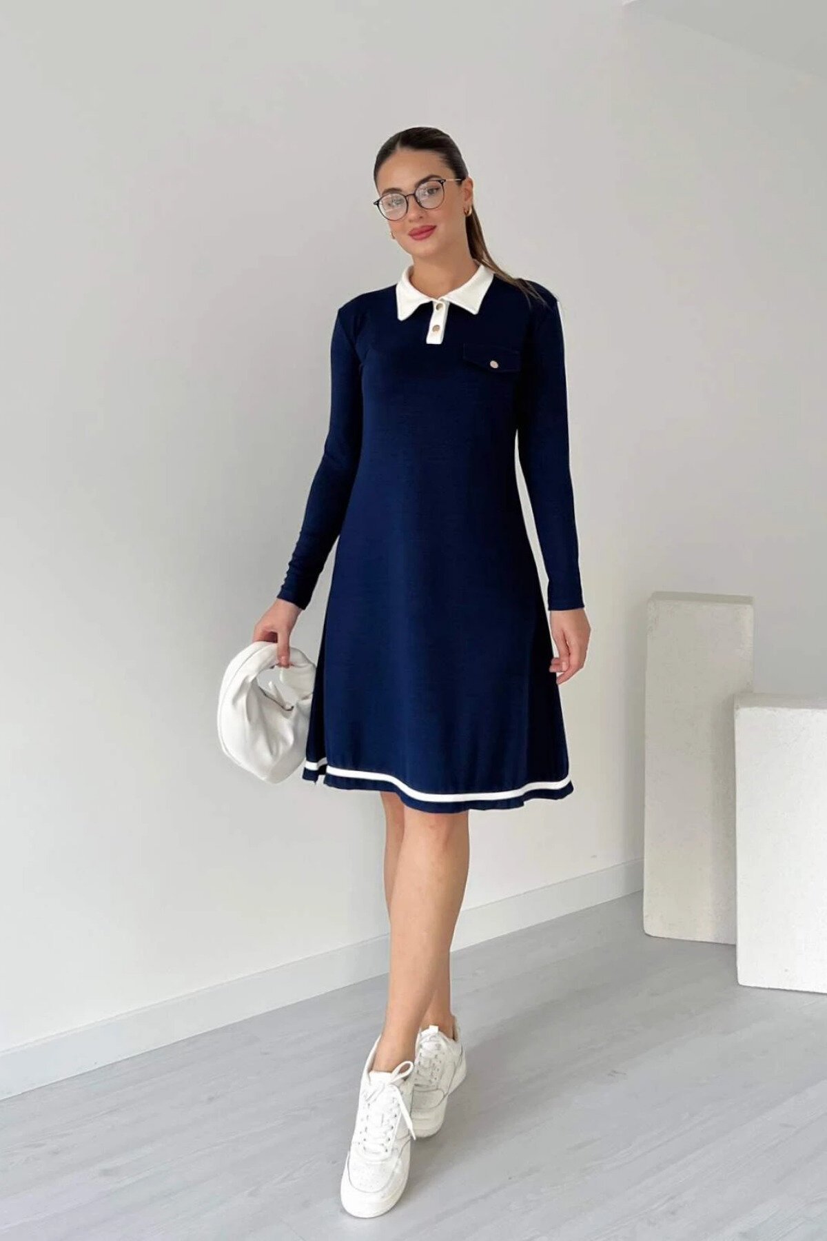 MOZENAPolo Yaka Uzun Kollu Modal Midi Elbise, Lacivert