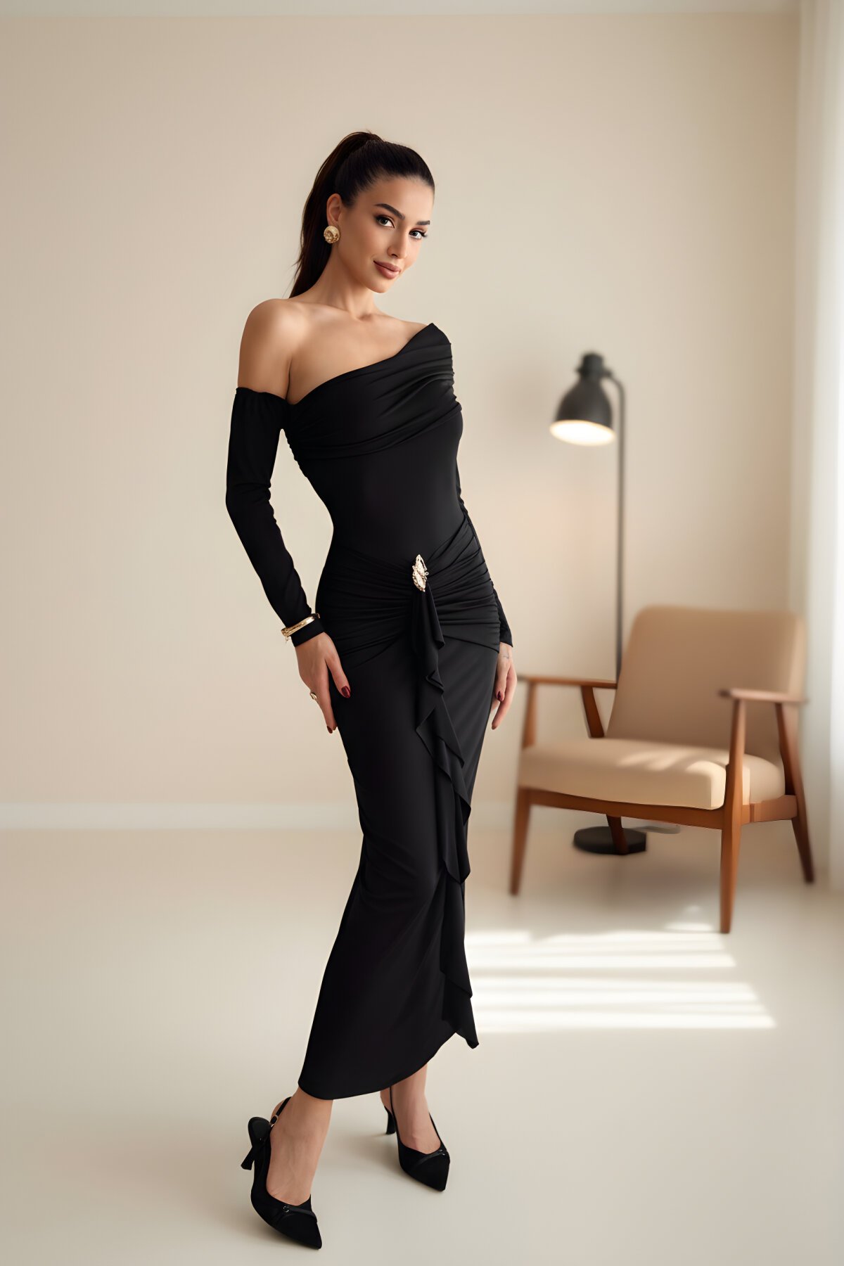 - Tek omuzlu, uzun kollu kesimi, sofistike bir dekolte sunarken, diğer omzun tamamen açık bırakılması feminen bir dokunuş katıyor. Bu asimetrik tasarım, boyun ve omuz hattını zarifçe vurgular.