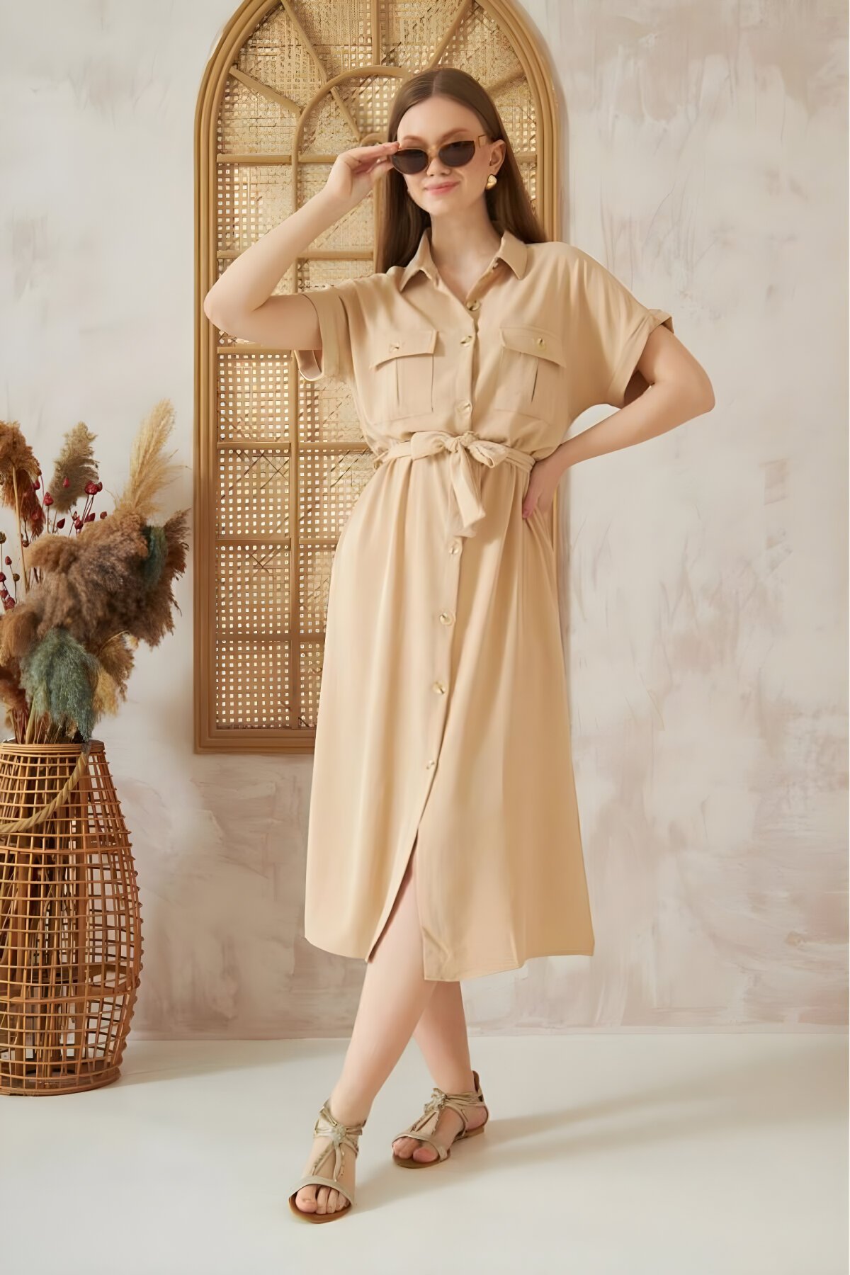 MegaButik, Pasaklı Giyim koleksiyonundan: Bej kırışmaz Airobin midi boy gömlek elbise, yaz şıklığınızı tamamlıyor. Kısa kollu, kemerli ve safari cepli detaylarıyla hem konforlu hem de tarz. Düğmeli yapısıyla kolay giyim sunan bu uzun gömlek elbiseyi hemen keşfedin ve dolabınıza ekleyin.