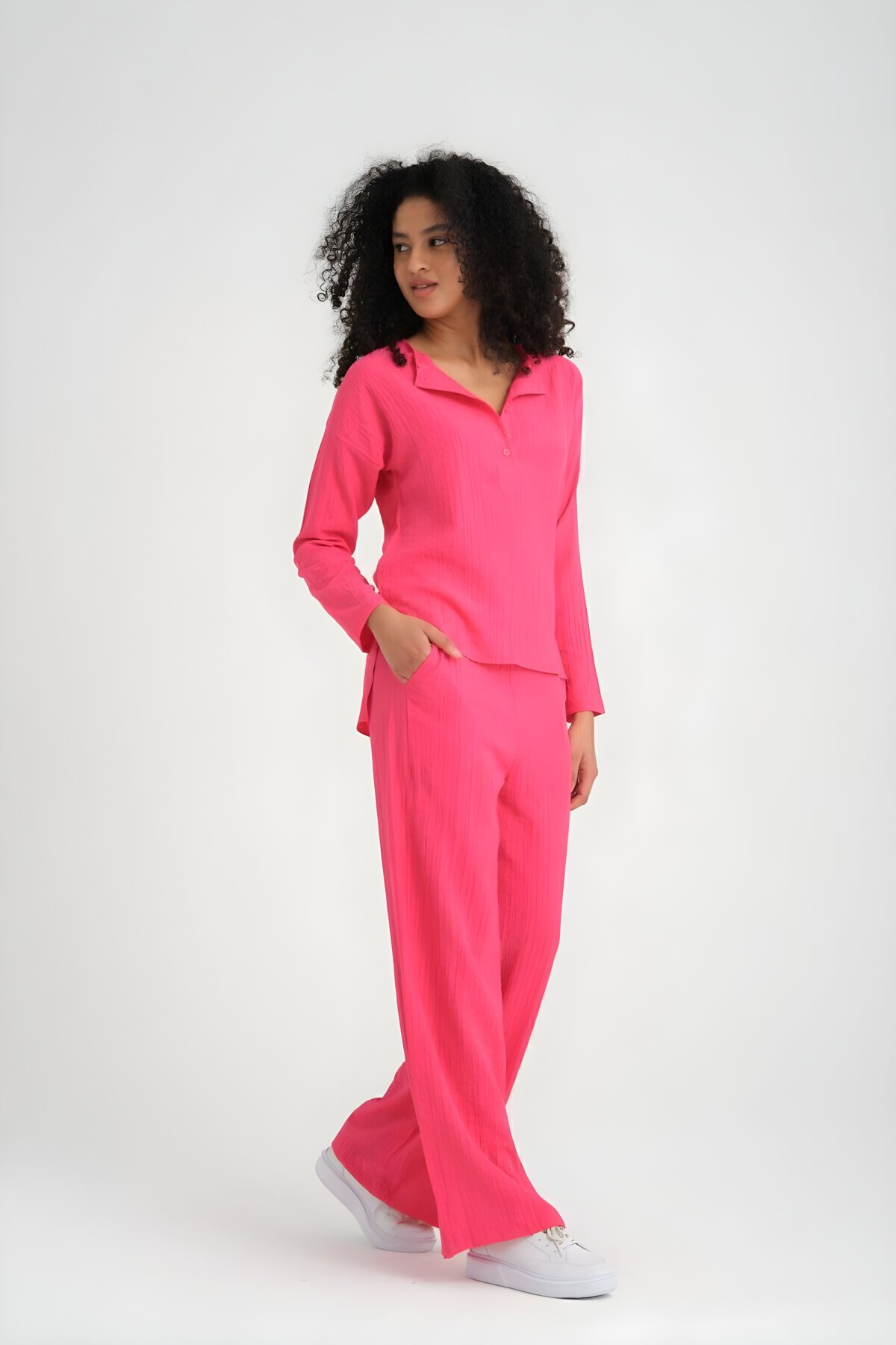 Pasaklı GiyimFuşya Dokulu Maya Kumaş Bol Kalıp Salaş Pantolon Bluz İkili Takım