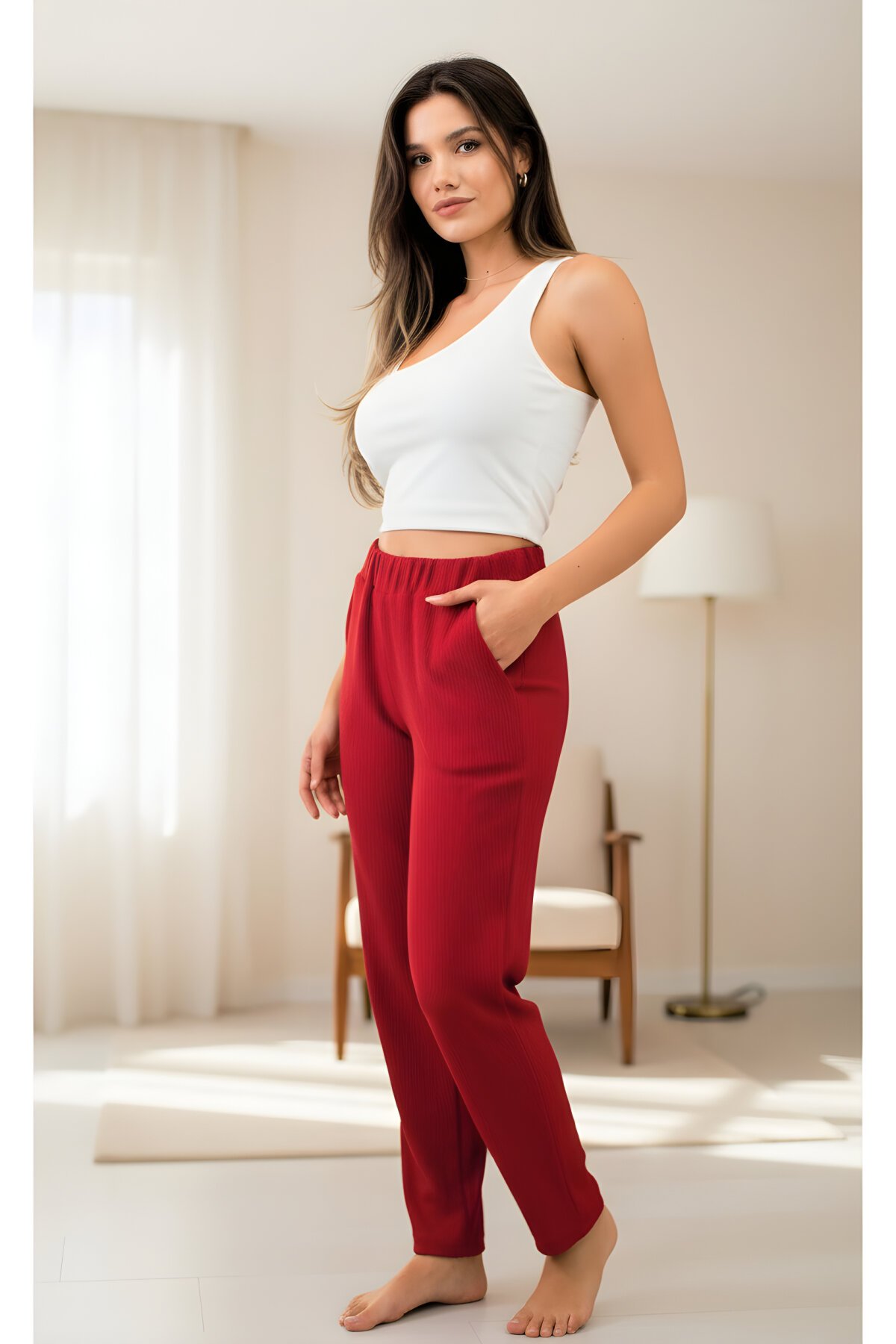 Pasaklı GiyimBeli Lastikli Yumuşak Dokulu Kırmızı Yüksek Bel Esnek Rahat Pantolon