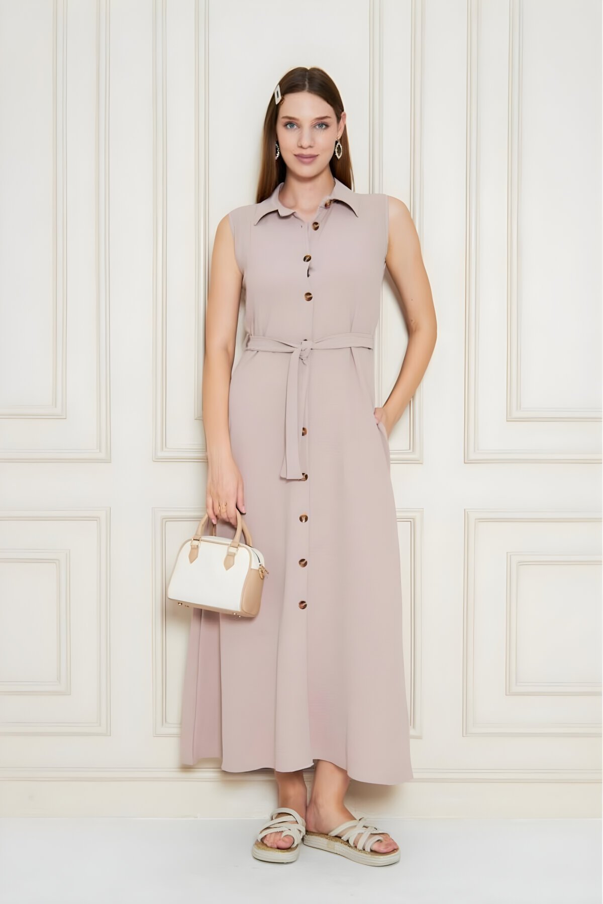 Pasaklı GiyimPudra Uzun Aerobin Kemerli Gömlek Yaka Yandan Cepli Elbise