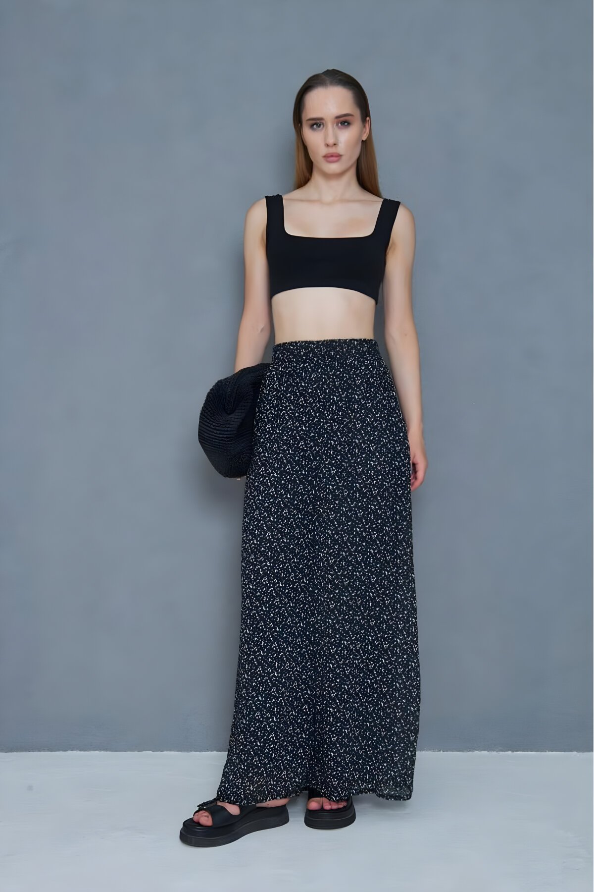Pasaklı Giyim Şifon Astarlı Siyah Çiçek Desenli Beli Lastikli Bol Paça Pantolon