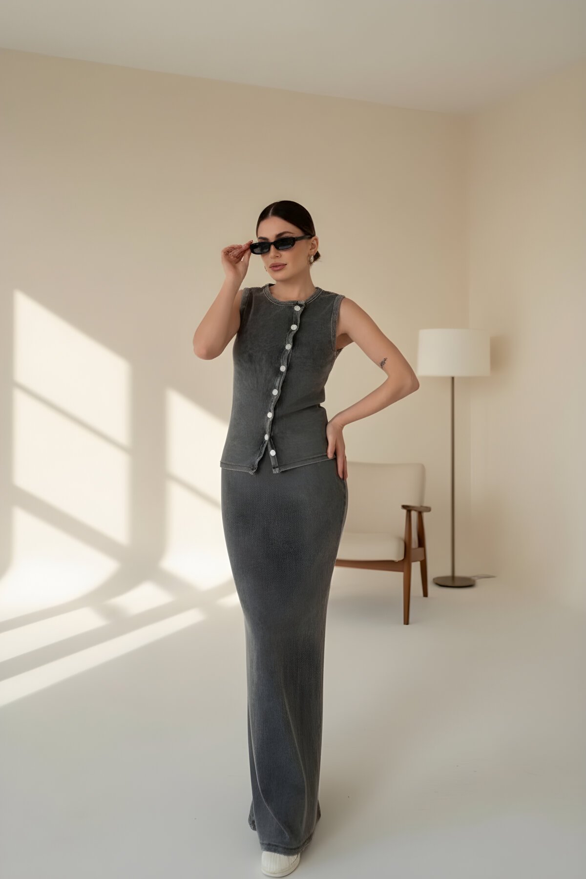 RAWEA FASHİON’un antrasit uzun etekli ikili takımı, minimalist çizgileriyle çağdaş bir stilin kapılarını aralıyor. Vücut hatlarını zarifçe takip eden bu takım, dokulu kumaşı ve asimetrik düğme detaylarıyla sıradanlığın ötesine geçerek modern ve stil sahibi bir görünüm sunuyor.