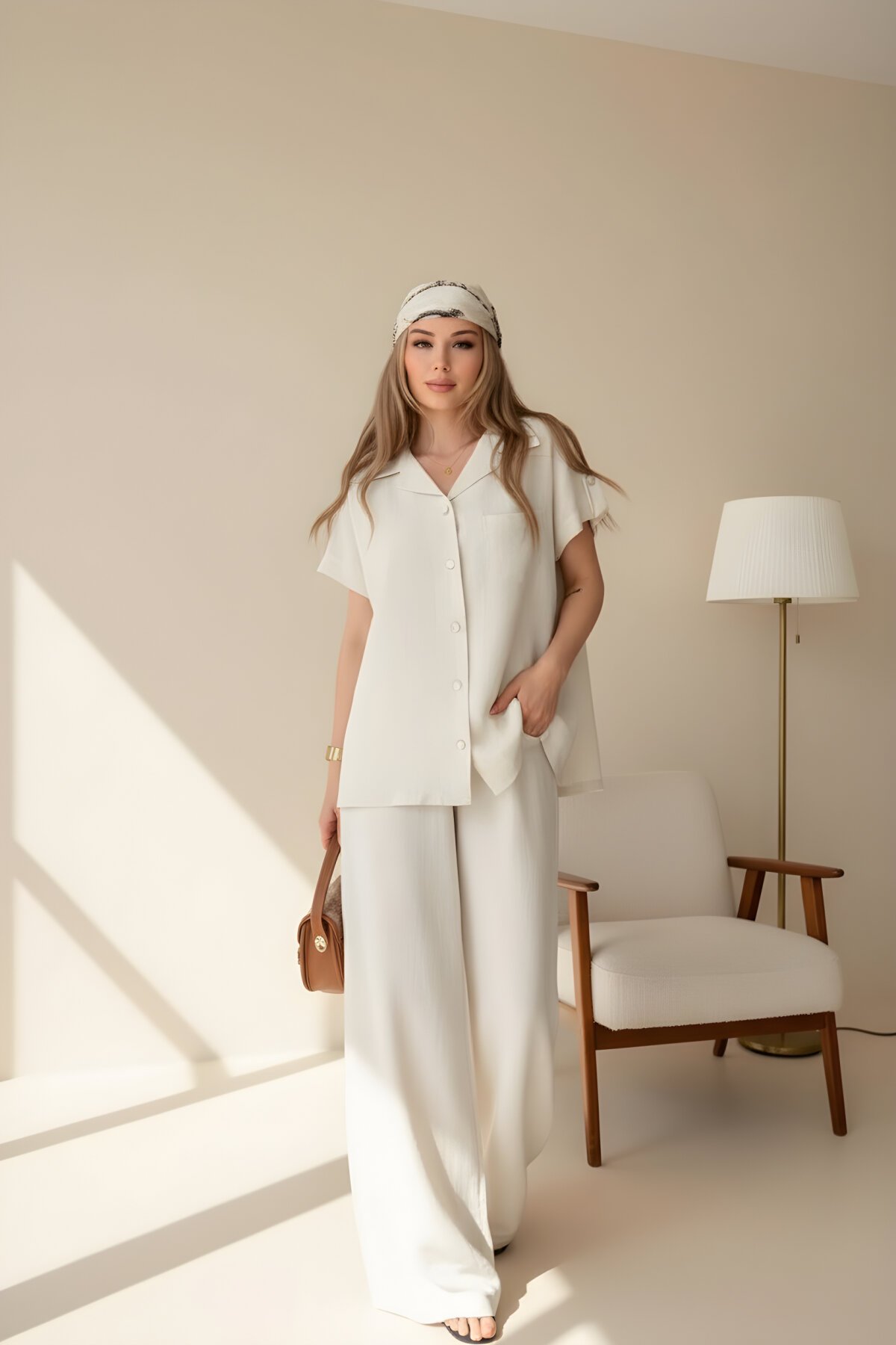 RAWEA FASHİONBeyaz Keten Kısa Kollu Cepli Gömlek Pantolon İkili Takım