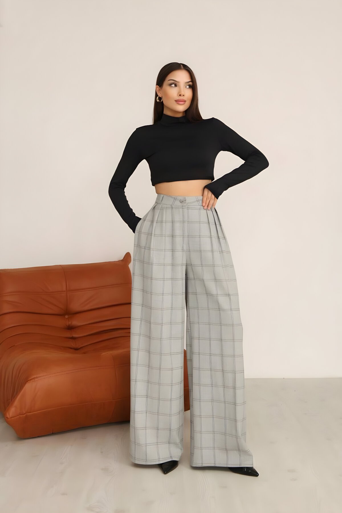 RAWEA FASHİONGri Ekoseli Poliviskon Kumaş Yüksek Bel ve Geniş Paça Şıklığı Palazzo Pantolon